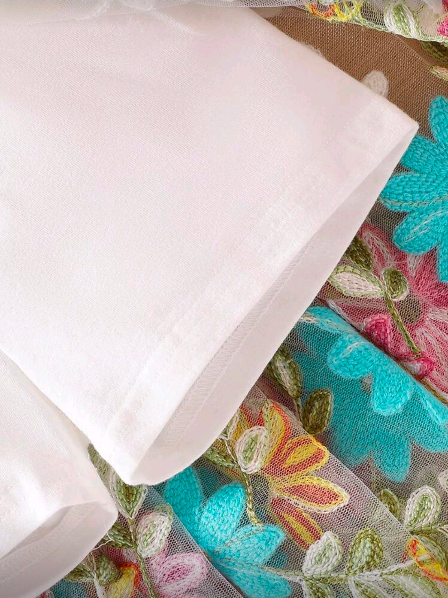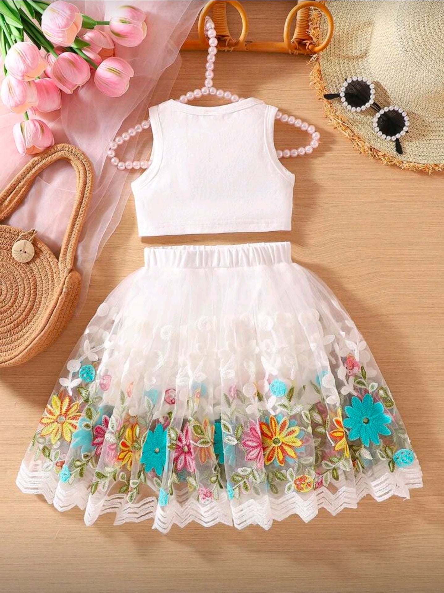 2 Pieces/Set Baby Girls Casual Cute Polka Dot Mesh Patchwork Vest Top & Heavily Embroidered Floral Mesh Patchwork Shorts Skirt, Girls Summer Outdoor Camisole&Shorts Outfit