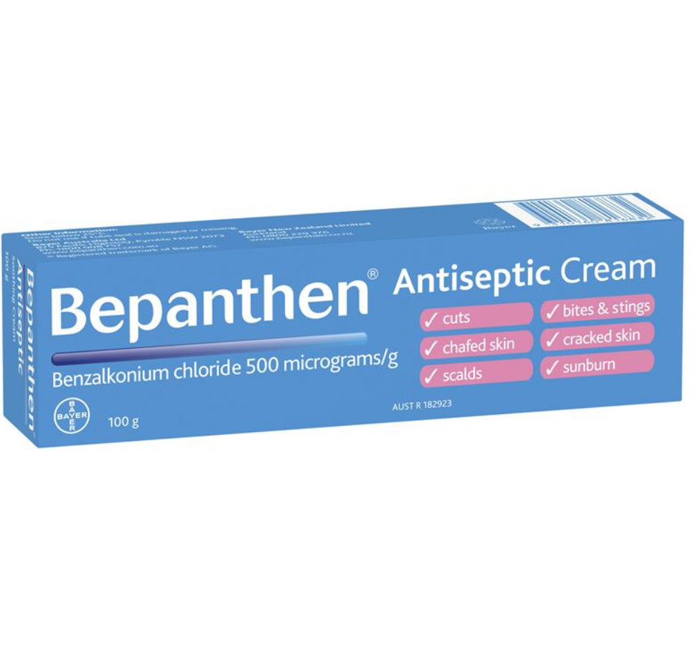 Bepanthen is an multi-purpose antiseptic cream that helps protect damaged skin from infection and is also effective for the treatment of cuts, abrasions, chafed & cracked skin, scalds, insect bites & strings, chapped hands, minor skin irritations and sunburn. Bepanthen Antiseptic cream helps the skin to repair. Gentle enough to be used on baby skin.- Helps protect damaged skin from infection.