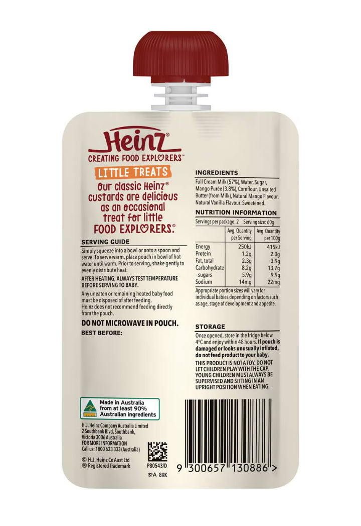 Heinz Little Treats Mango & Vanilla Custard is a great occasional treat for Food Explorers aged 8+ Months. It's made with no artificial flavours or colours, and no preservatives either.