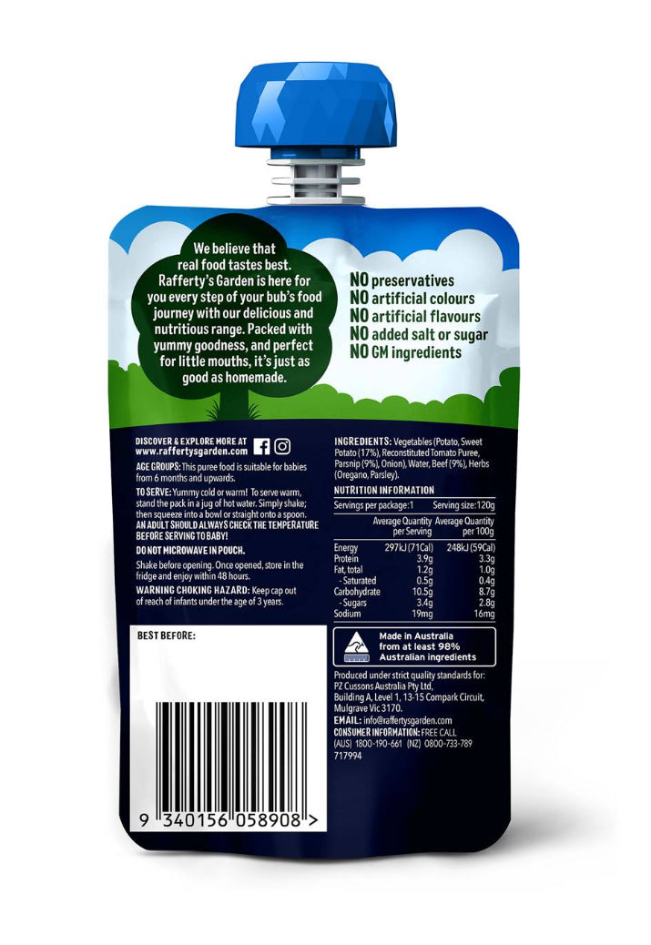 Our Beef, Sweet Potato & Parsnip pouch is a tasty meal option when you're ready to introduce your little one to protein. With Australian beef and veggies, this puree is a source of protein and has no artificial colours or flavours, and no added salt or sugar.