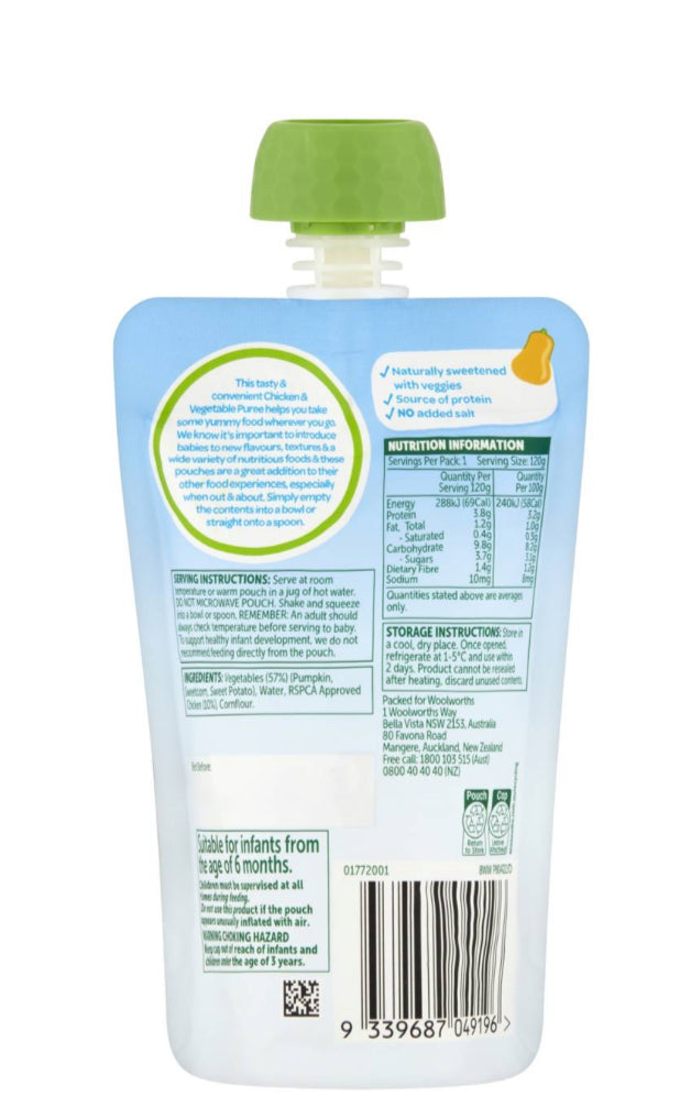 We understand how important a hassle free meal time is with your smiling bub. That's why we've developed this Chicken & Vegetabe Puree which brings your little one a yummy meal all packed into a convenient pouch that's perfect to take on your adventures together. This puree is a great way to introduce different textures to your growing bub.