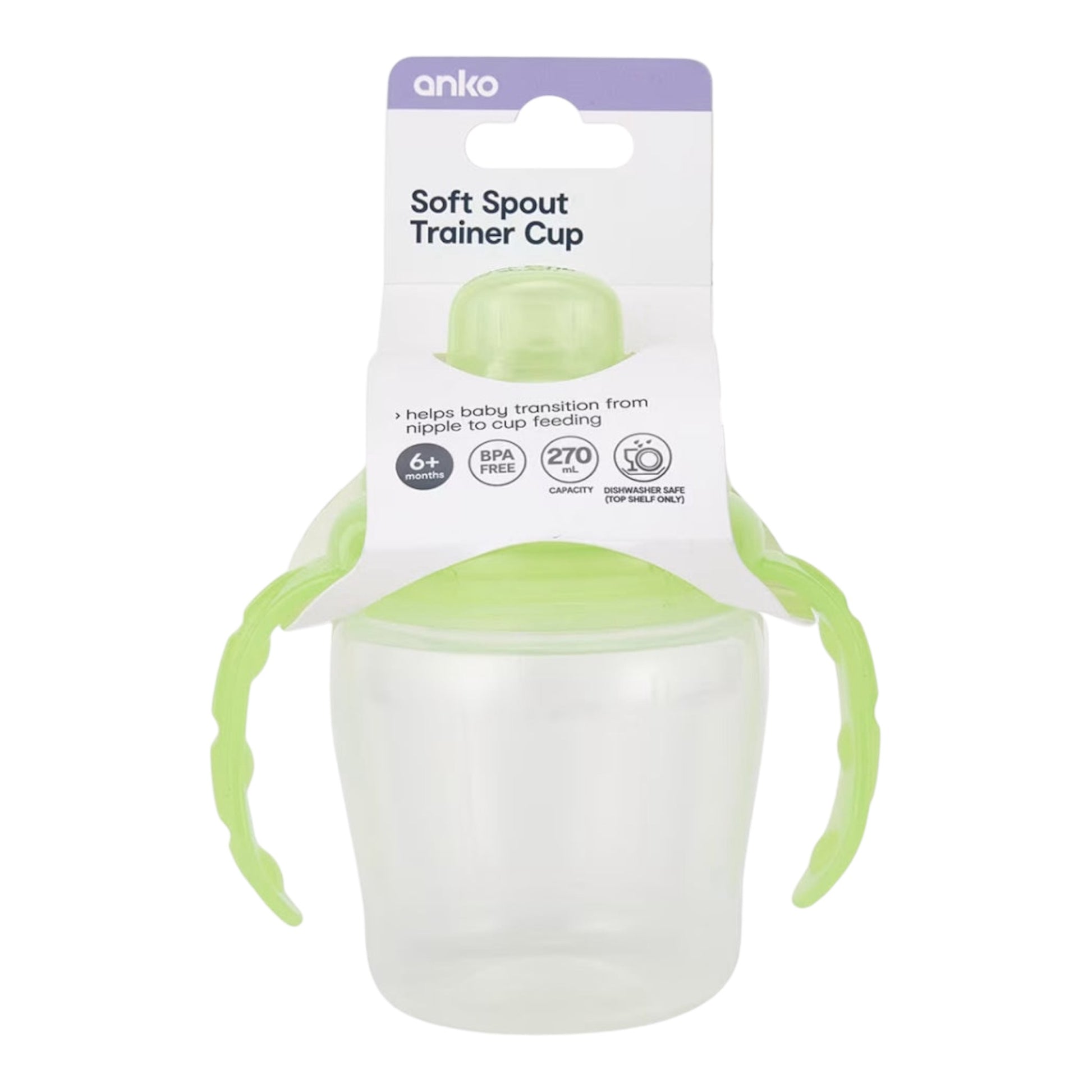 Help your baby transition from nipple to cup feeding with the soft spout trainer cup.