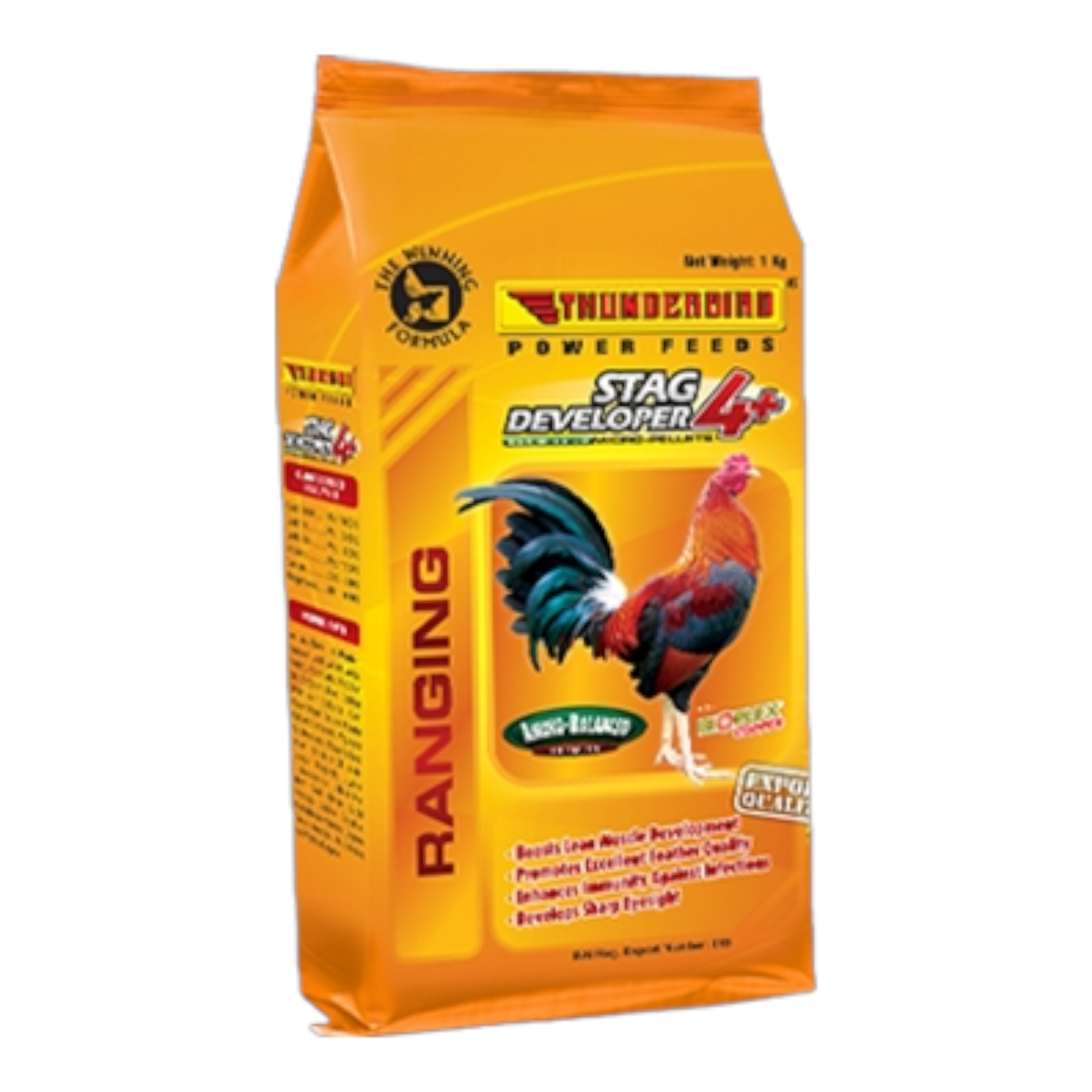 Thunderbird Stag Developer 4+ has an amino-balanced formula that ensures proper body-frame and muscle development of stags. Bioplex Copper has been added to ensure that key biochemical/metabolic functions related to gamebird growth, health and immunity are well supported. It is recommended to be given to gamebirds from 4 months to 6 months.